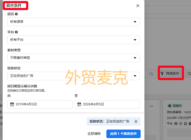 筛选条件这里可以根据语言、平台、素材类型、投放状态,日期来筛选。我就不筛选了,这里默认显示 正在投放的广告。