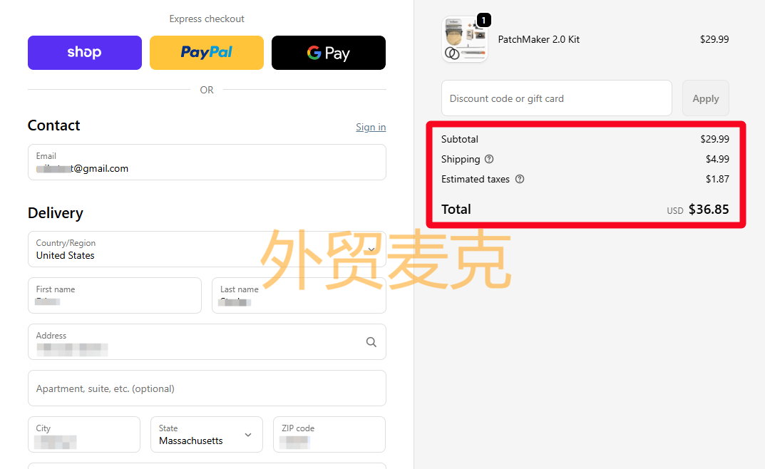 我们来估算一下单个产品的利润空间,如果客户买1个产品,29.99美元,运费和税费都和客户的具体派送地址相关,我就以美国马萨诸塞州的一个地址为例,运费算4.99,税费1.87,那就是36.85美元。