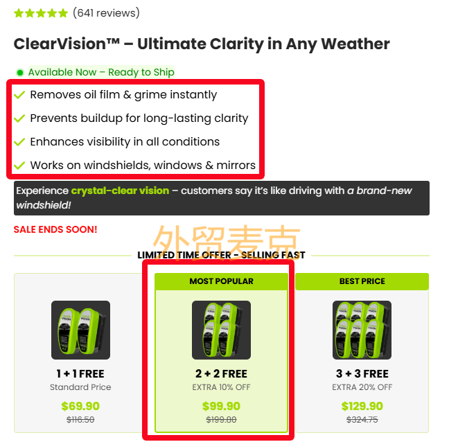 产品页面列举了4个卖点,默认购买的套装,买2个送2个,99.9美金。