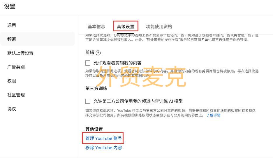 步骤2:选择 高级设置,下拉到 其它设置 的 管理YouTube账号。